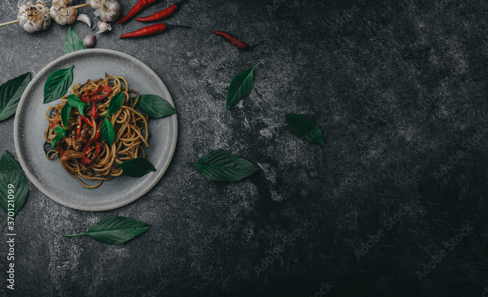 Food background copy ,Hot and spicy Spaghetti with chicken top view,Chicken spaghetti pasta over black stone background with vegetables, italian food. Stir Fried Spicy Spaghetti with Chicken in dark t