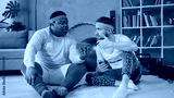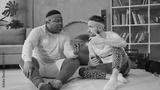 Multi-ethnic fun guys using smartphone, wearing colorful retro vintage outfits and resting after hard yoga workout training at home.