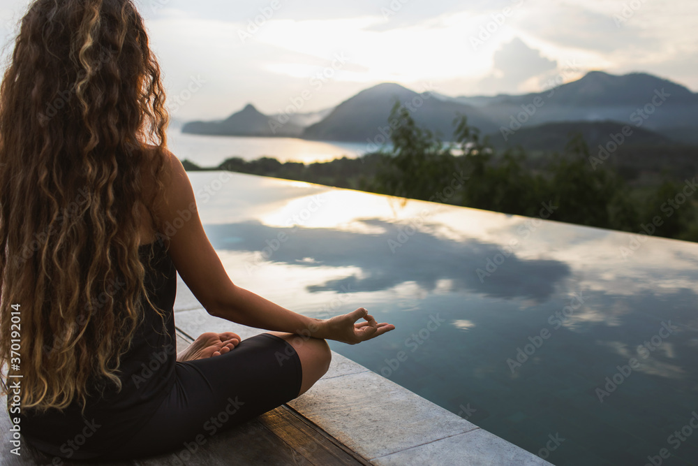 Woman meditating and practicing yoga alone at sunrise near infinity pool with mountains on horizon. Rear view. Travel Lifestyle spiritual relaxation concept. Harmony with nature.