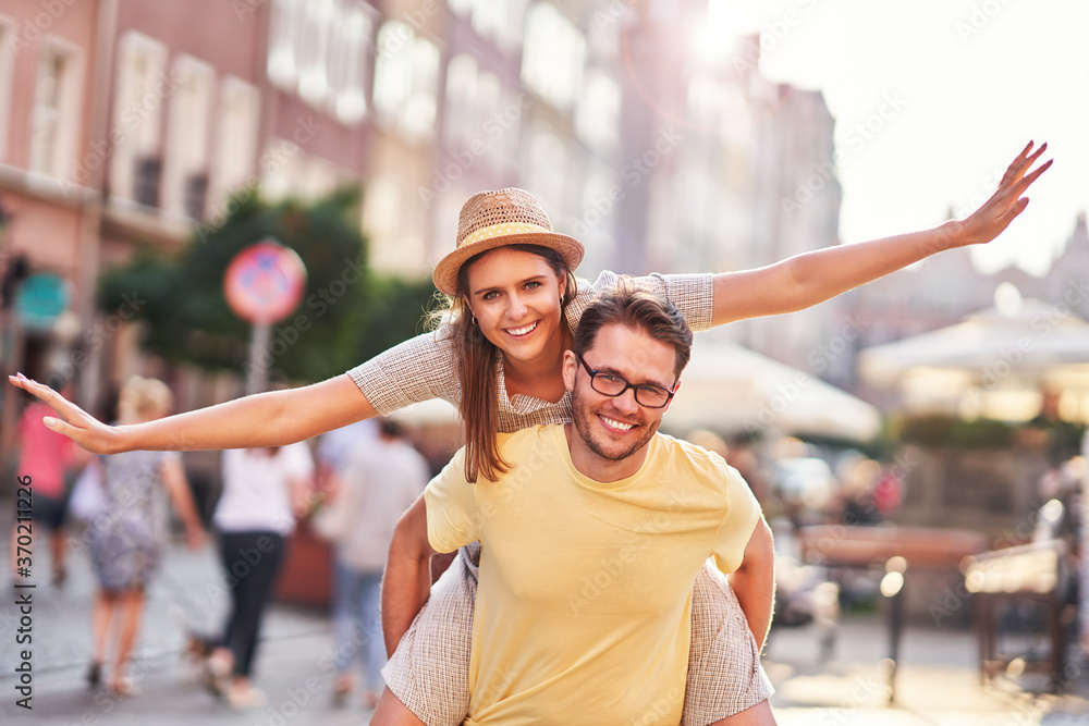 Adult happy tourists sightseeing Gdansk Poland in summer
