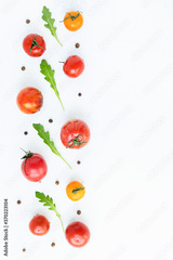 assortment of bright, ripe, multi-colored tomatoes, on a white worn background. the view from the top. concept of the harvest season