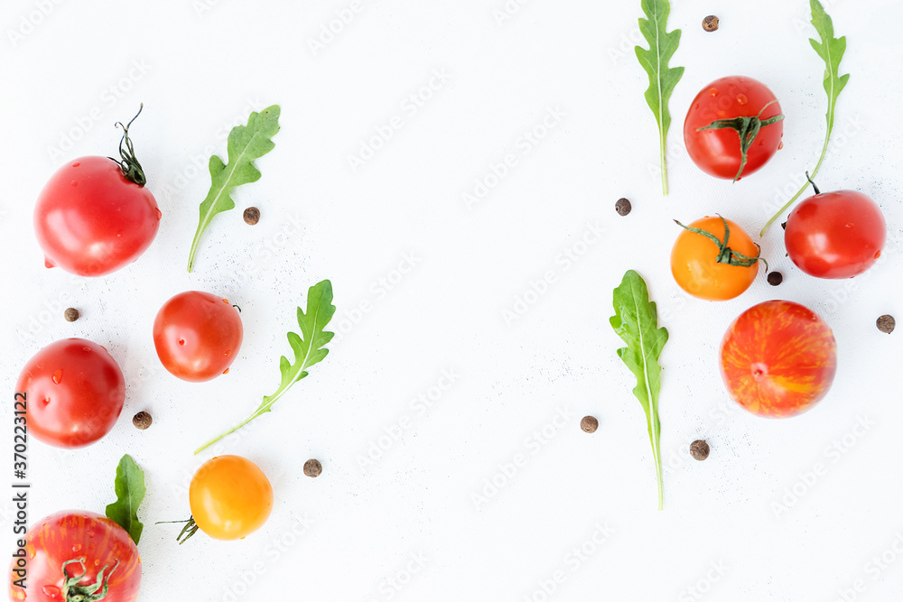 assortment of bright, ripe, multi-colored tomatoes, on a white worn background. the view from the top. concept of the harvest season