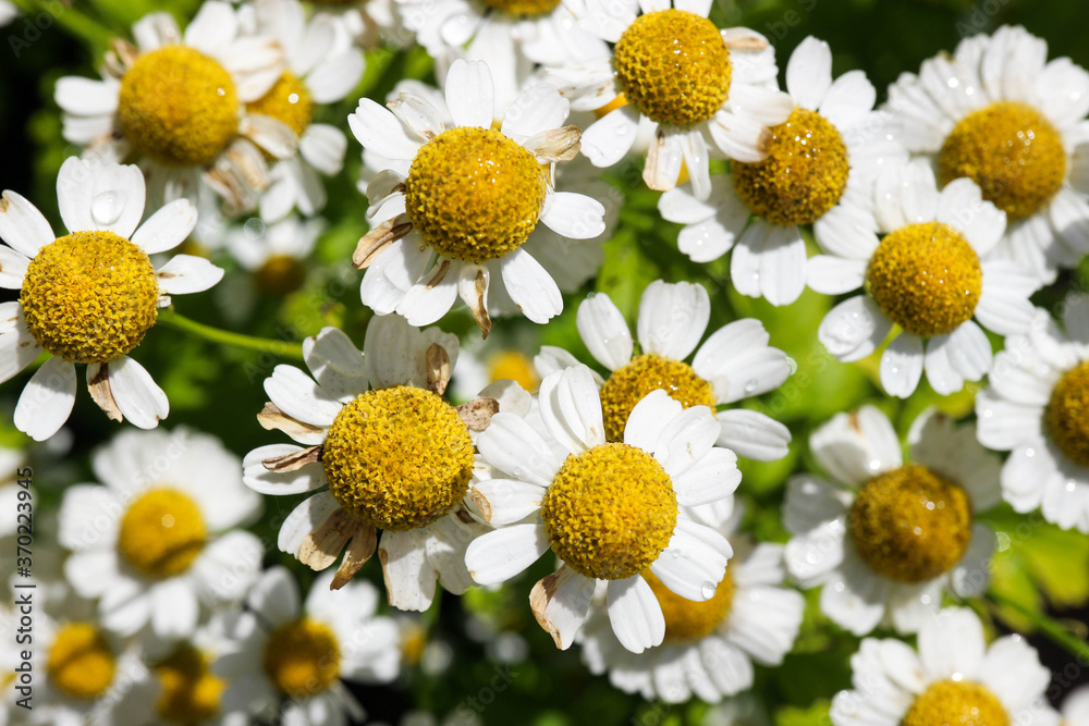 yellow chamomile flowers in the garden after the rain closeup wallpaper background