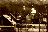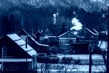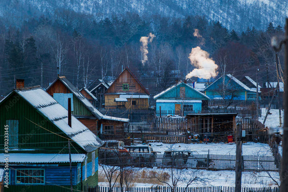 Russian village. Wooden huts with smoke from chimneys in the winter season