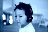 Close up image of charming sweet 3 year old little boy with curly hair posing indoors with wireless headset, listening to music or fairytale online, having curious thoughtful facial expression