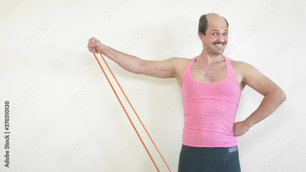 handsome cheerful balding man goes in for sports at home
