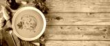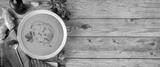 Top view of winter spicy lentil soup on graw wooden background