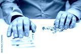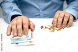 Sell gold jewellry, pawnbroker with euro banknots in the hand