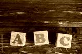 Cubes with letters ABC on rustic wooden table