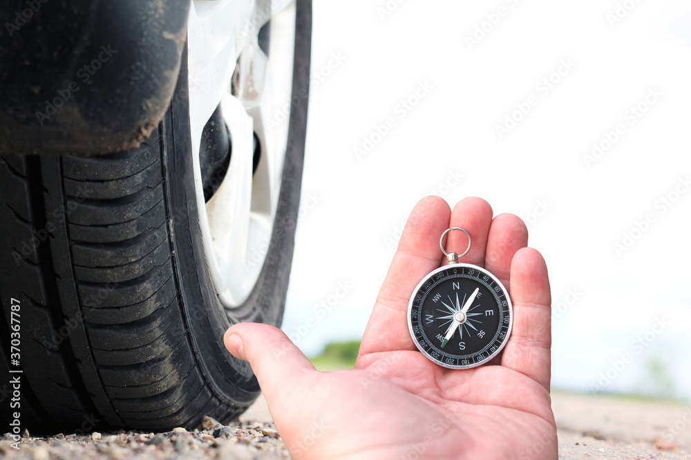 Abstract image of compass in man's hand on background of car wheel with summer tires as symbol of tourism with compass, travel with compass and outdoor activities with compass