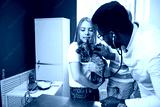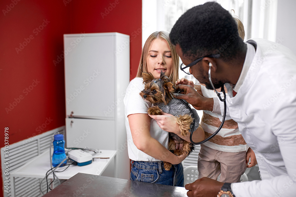 african veterinarian conducting a review with dog, examining, use stethoscope in vet clinic, little dog on owner's hand