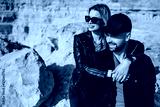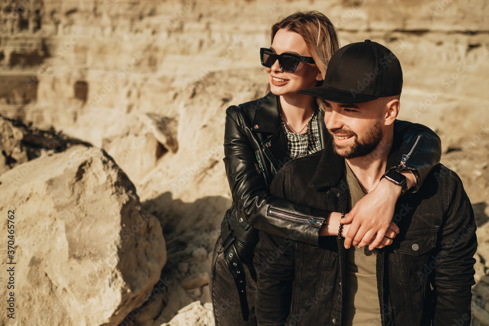 Happy Young Couple Dressed Alike in Black Leather and Jeans Jacket Having Fun Time Outside the City