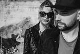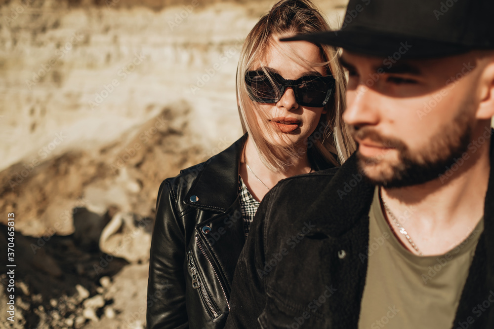 Happy Young Couple Dressed Alike in Black Leather and Jeans Jacket Having Fun Time Outside the City