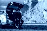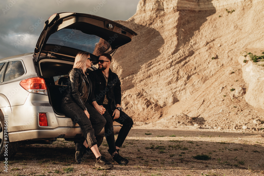 Happy Young Traveler Couple Dressed Alike in Black Leather and Jeans Jacket Having Fun Time on Road Trip Outside the City