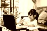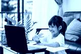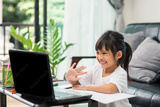 Asian girl student online learning class study online video call zoom teacher, Happy girl learn english language online with laptop at home.New normal.Covid-19 coronavirus.Social distancing.stay home