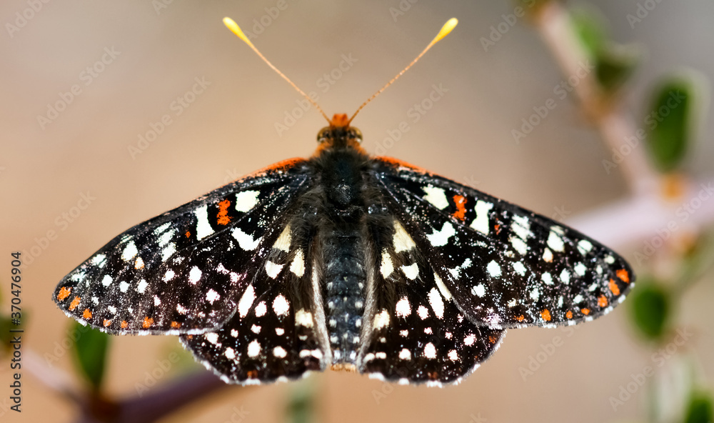 Variable checkerspot butterfly closeup. Santa Clara County, California, USA.