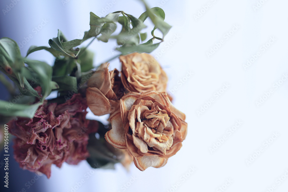 青い背景の黄色いバラとカーネーションのドライフラワー
