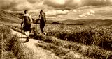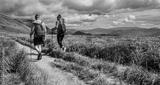 Hiking couple in the mountains. Mountain landscape on the summer. Mountain landscape in Poland Bieszczady.