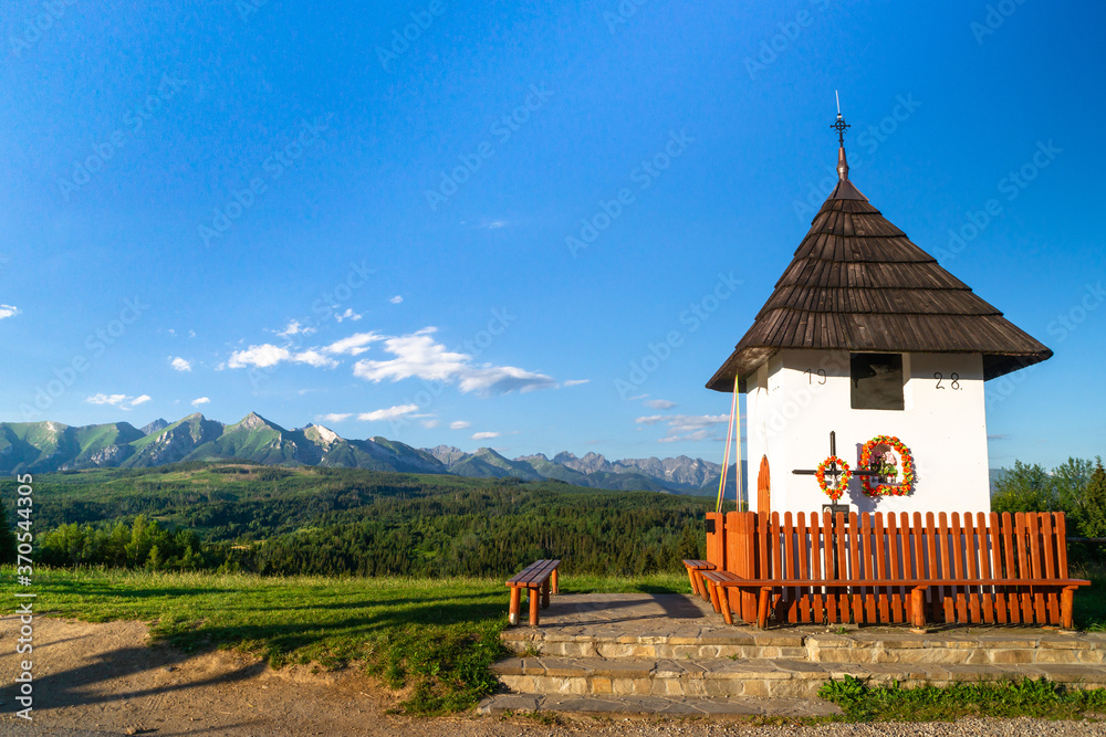 Przełęcz nad Łapszanką, zabytkowa kapliczka i panorama Tatr