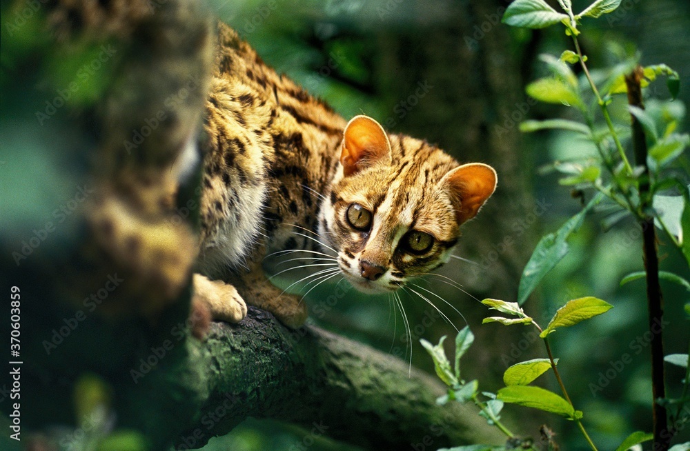 Leopard Cat, prionailurus bengalensis, Adult standing on Branch