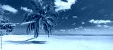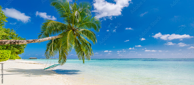 Tropical beach background as summer landscape panorama with beach swing or hammock and white sand and calm sea beach banner. Perfect beach scene vacation or summer holiday concept