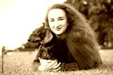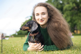 Portrait of a girl with a dog. Dachshund black