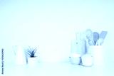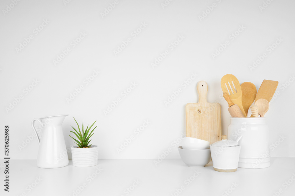 Kitchenware and utensils on a white shelf or countertop with a white wall background and copy space. Home kitchen cooking decor.