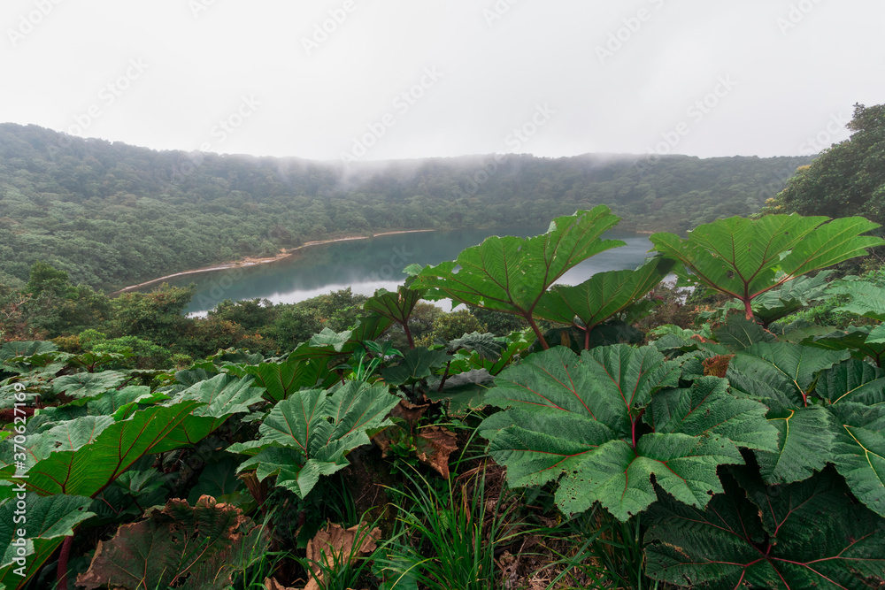 Volcanic Crater Lake Botos surrounded by tropical jungle