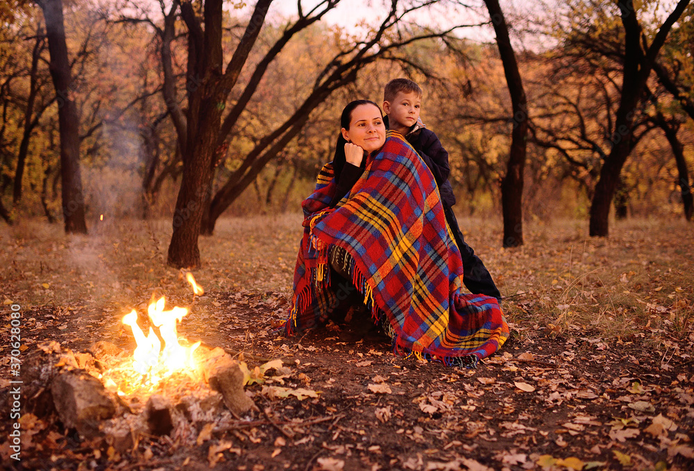 a small child boy with his mother covered with a plaid blanket sitting by the fire on the background of the autumn forest