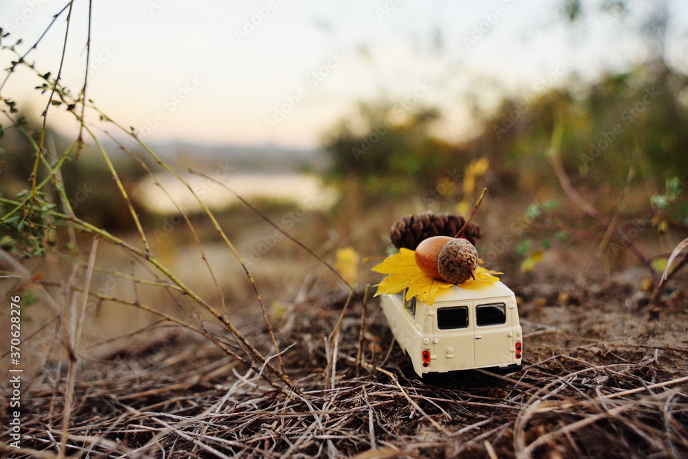 autumn concept - a toy car driven on the roof of acorns, Rowan berries, yellow leaf and a bump on the background of autumn trees. Space for text, copy space.