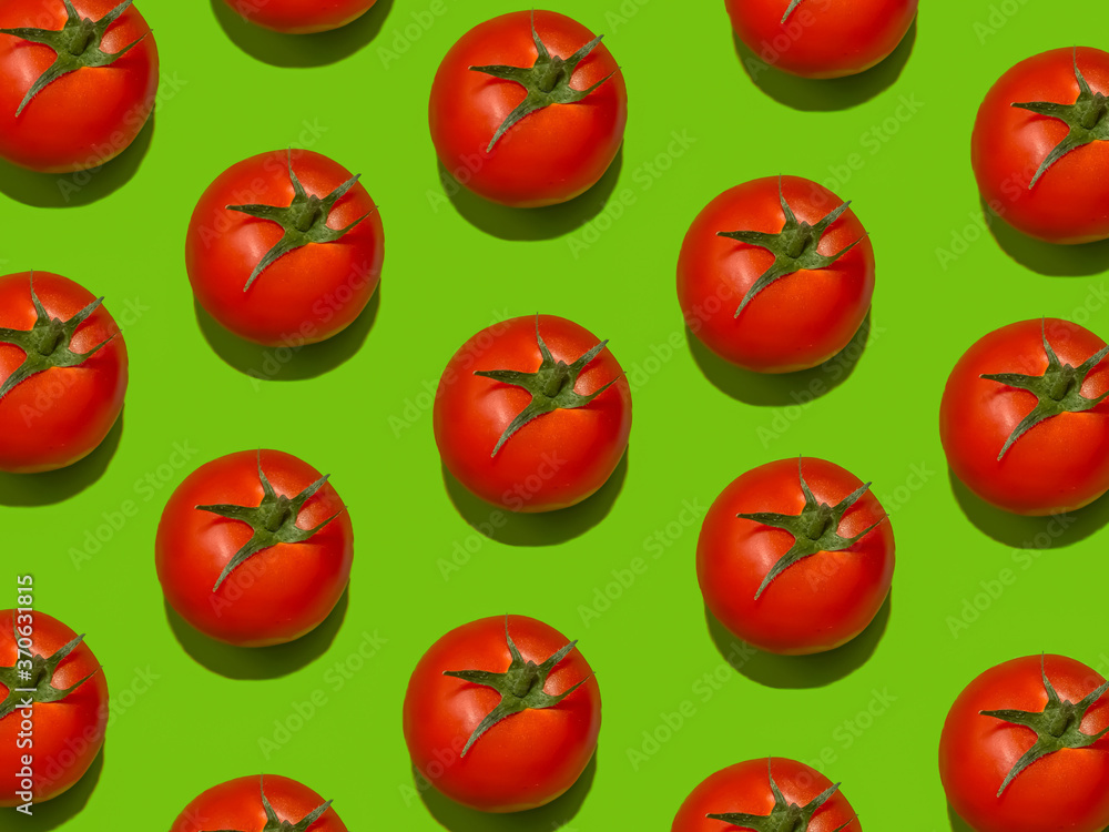 Set of tomatoes on a light green background. Tomato pattern. Healthy lifestyle and nutrition.