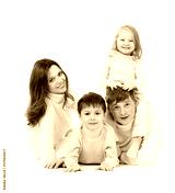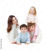 happy family lying on floor in studio isolated on white