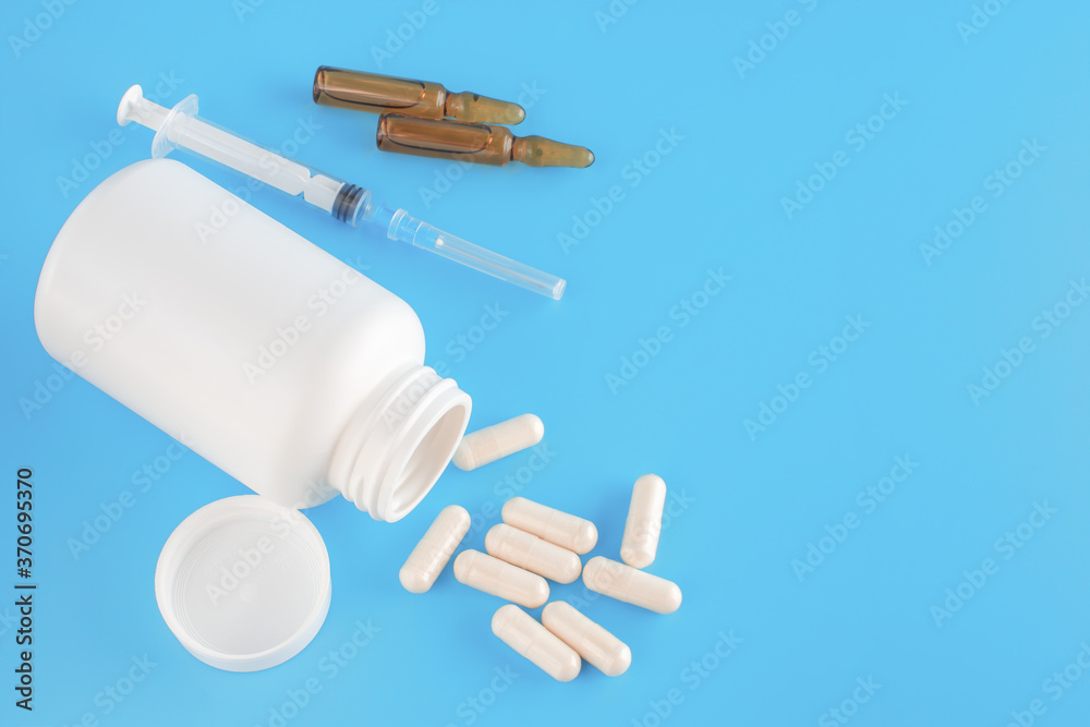 Pills, capsules, syringe, White medical containers and ampoules on blue background. Medical vial for injection with a syringe. Medical background