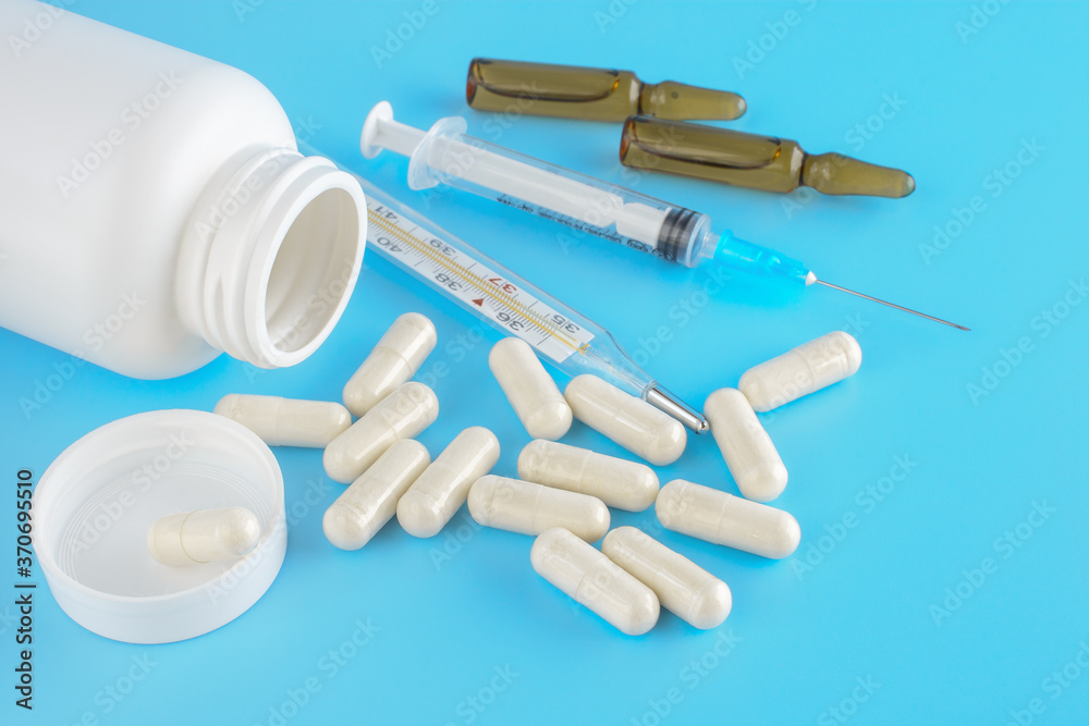 White medical containers, Pills, Syringe, ampoules for injections on a blue medical background. close up, top view.