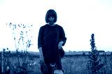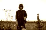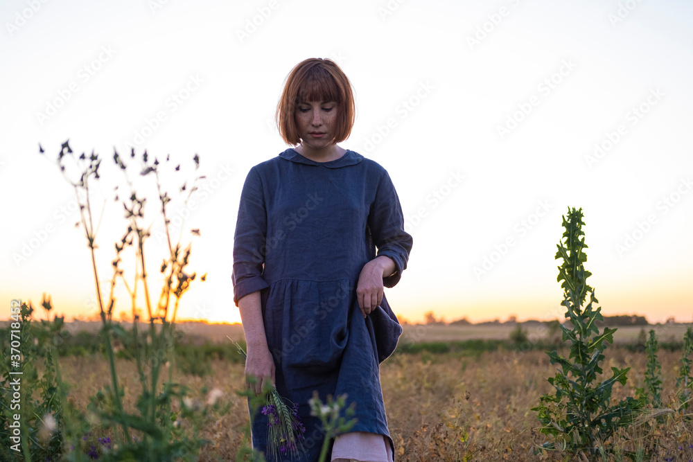 Young redhead woman with freckles in vintage handmade dress walk in fields with flowers