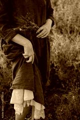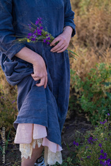 Young redhead woman with freckles in vintage handmade dress walk in fields with flowers