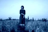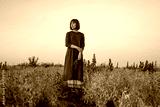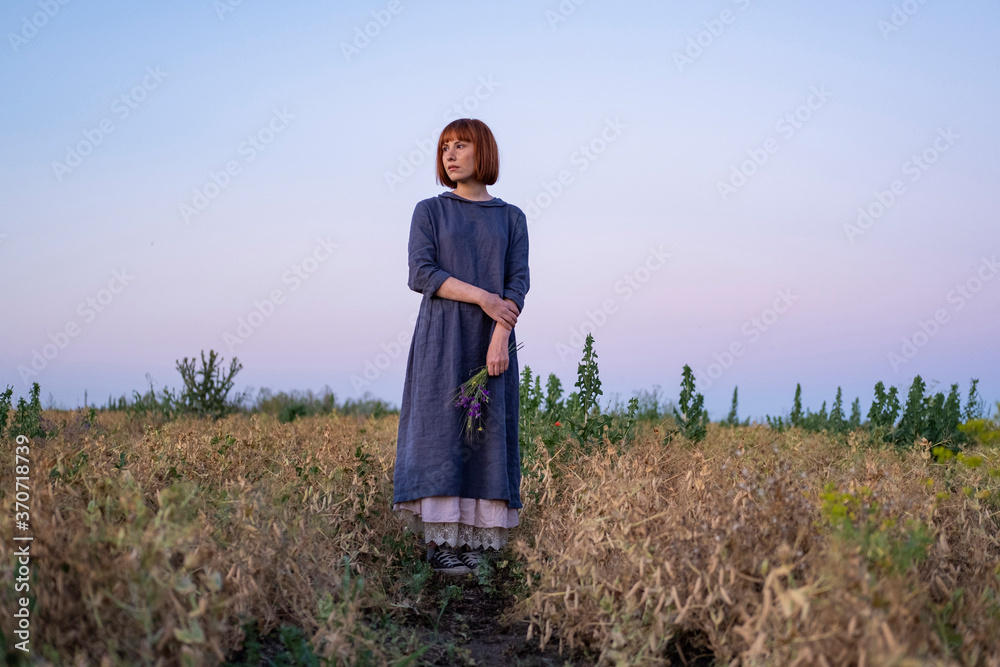 Young redhead woman with freckles in vintage handmade dress walk in fields with flowers