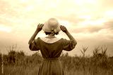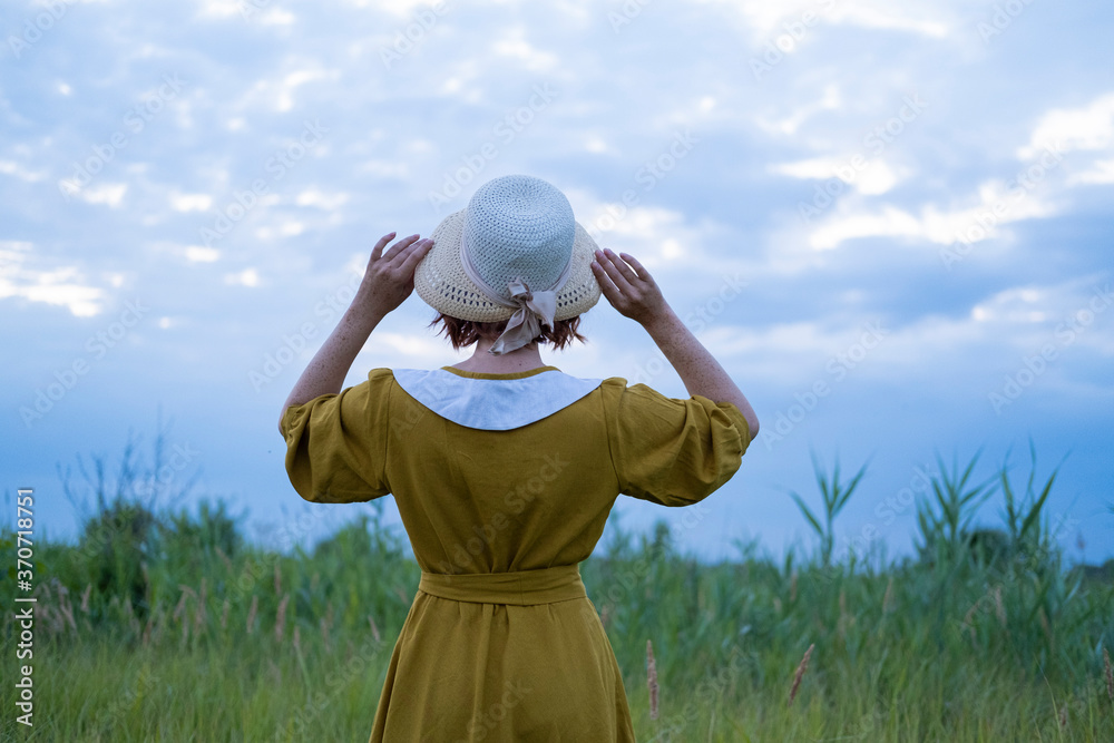 Young redhead woman with freckles in vintage handmade dress walk in fields with flowers
