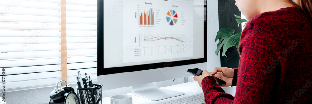 Asian woman working from home using computer and drinking coffee in her bedroom document finance and conference online meeting for new projects
