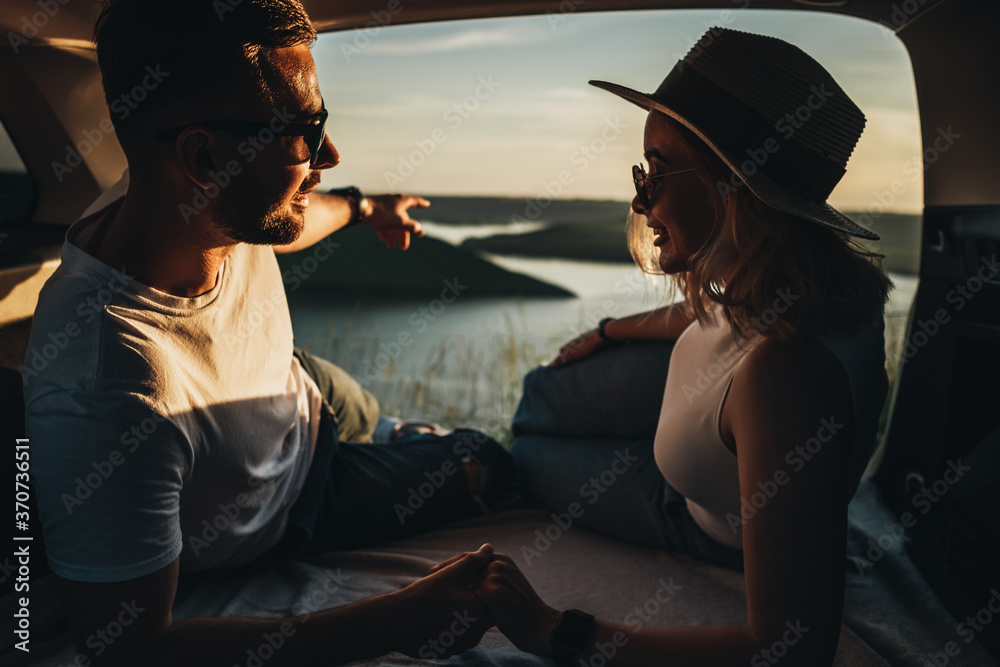 Man and Woman Relaxing Inside the Car Trunk Enjoying Weekend Road Trip, Travel and Adventure Concept