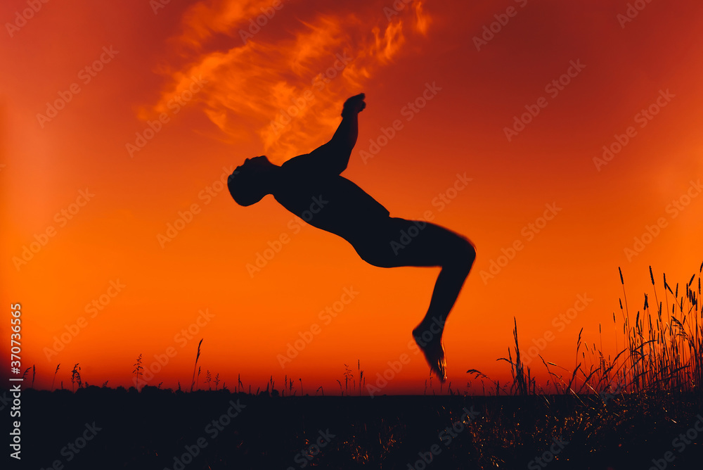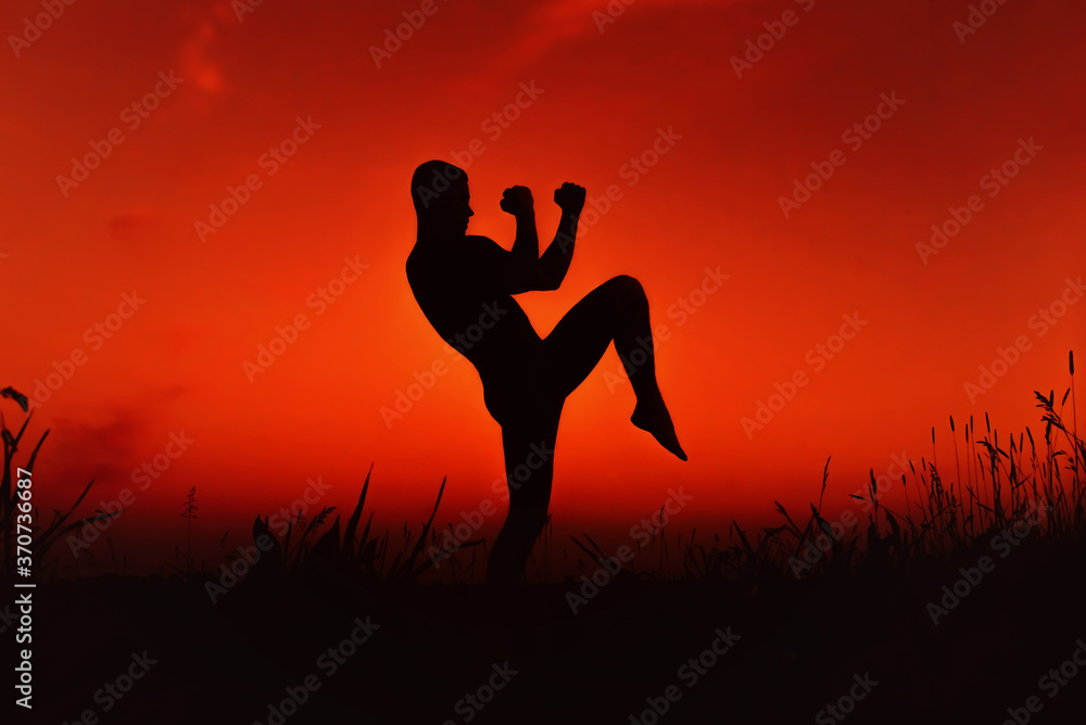 Silhouette of a male fighter engaged in training in nature