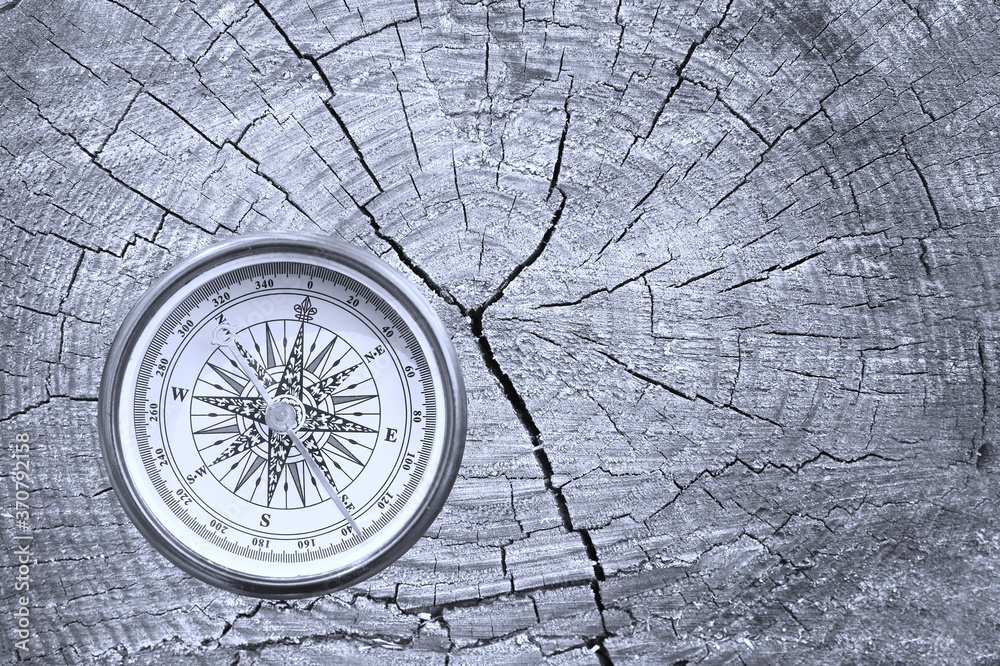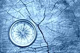 round compass on blue wooden background as symbol of tourism with compass, travel with compass and outdoor activities with compass