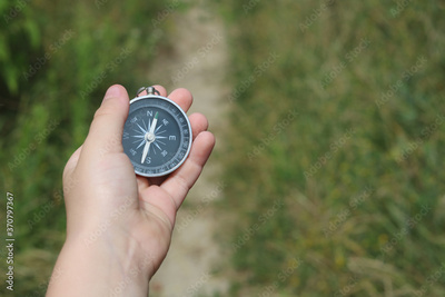 Old classic navigation compass in hand on natural background as symbol of tourism with compass, travel with compass and outdoor activities with compass
