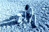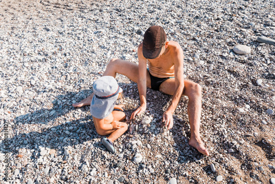 Toddler girl and grandfather playing with pebbles on beach