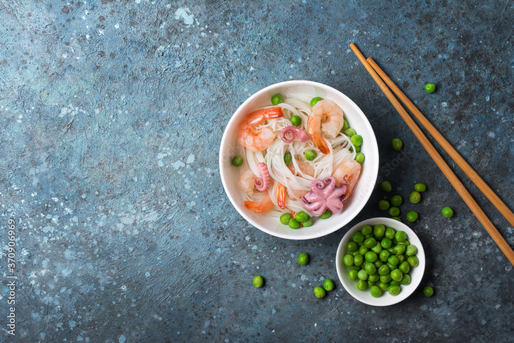 A traditional dish of Asian cuisine. Rice vermicelli with shrimps, bebe octopus and green peas