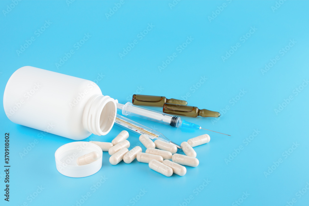 Pills, capsules, syringe, White medical containers, ampoules and Medical mercury thermometer on blue background. Medical background