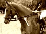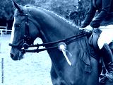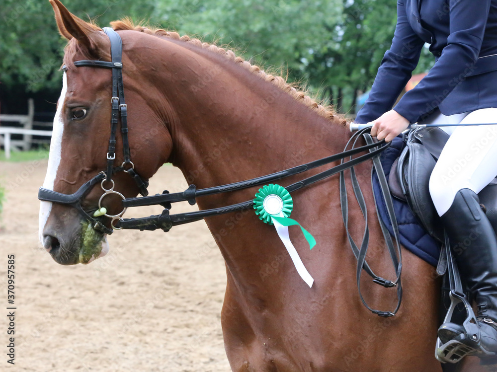 Head shot close up of a pretty horse with a red rosette on its bridle