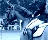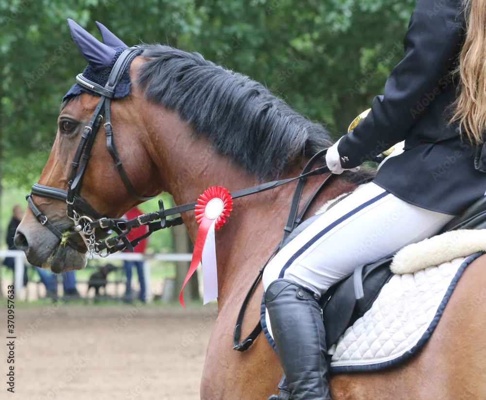 Head shot close up of a pretty horse with a red rosette on its bridle