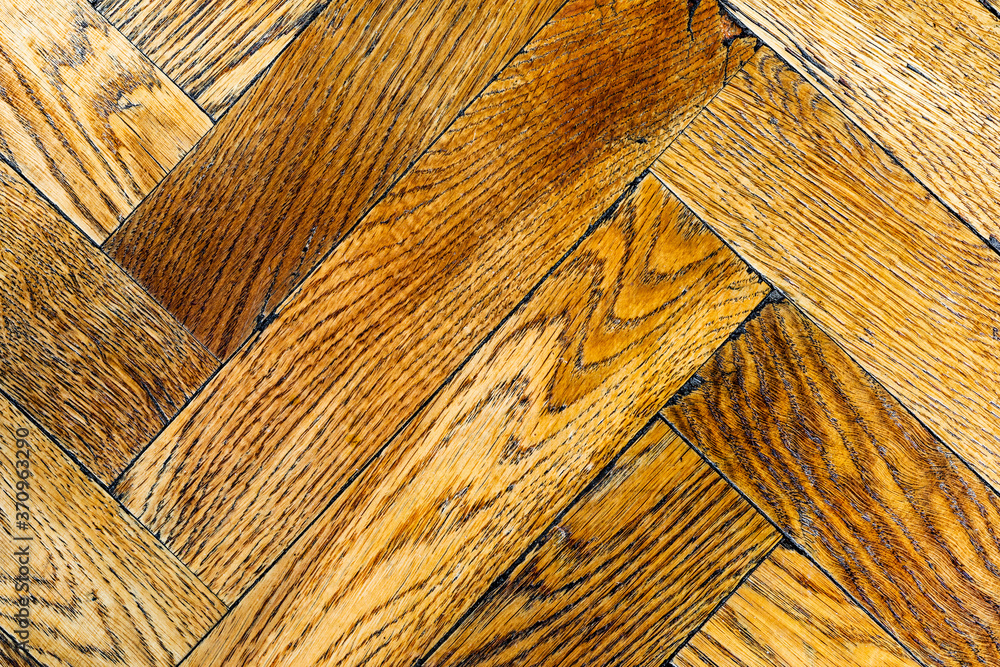 90 years old parquet floor. Natural oak tree texture. Wooden background with organic pattern vintage planks. Macro photography, up view.