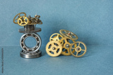 An abstract mechanical composition, installation made up of antique bearings and bronze cogs wheels gears of various kinds. Blue background